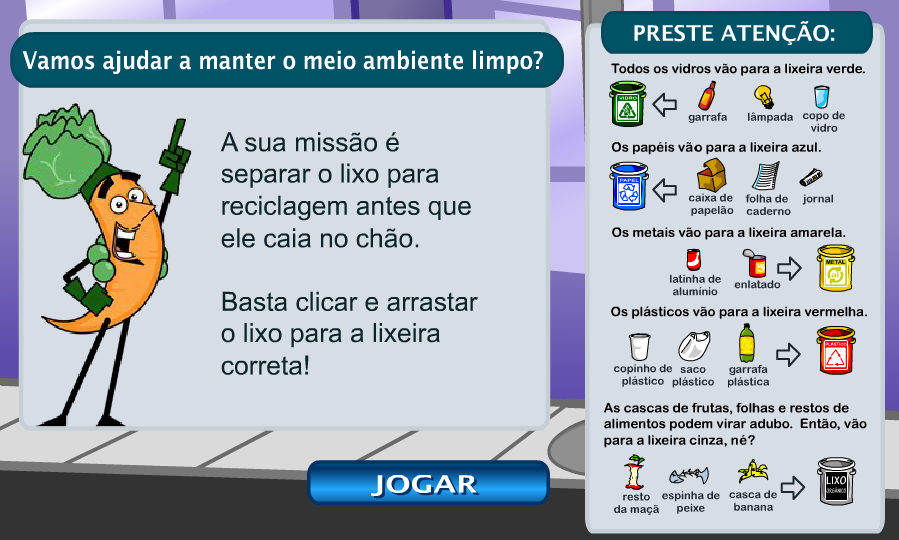 Jogo que possibilita aos alunos reconhecer as diferenças entre o lixo e resíduo e identificar a importância da coleta seletiva para a preservação do meio ambiente. Atende ao tema Vida e Ambiente. Indicado para o Ensino Fundamental dos Anos Iniciais.